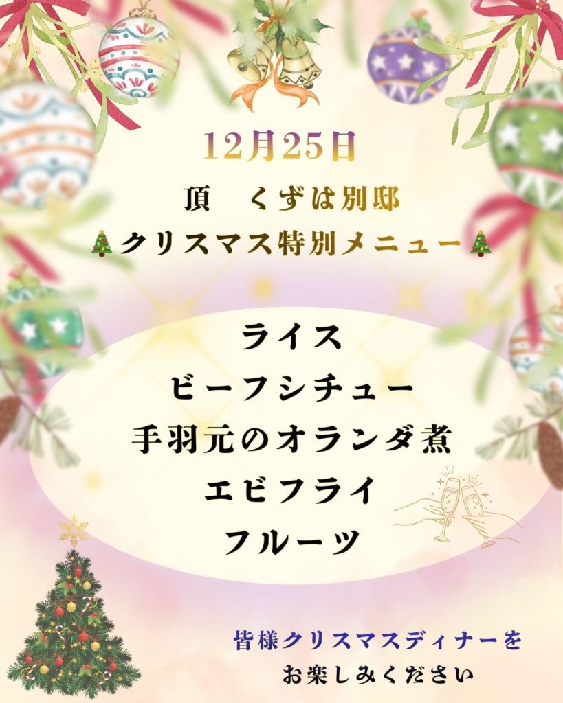 ✨🎄Happy Merry Christmas🎄✨ 2025 12/25 イベント 2025年12月25日 今日はクリスマスです。別邸のクリスマスツリーがデビューいたしました❤「きれいね!!」「可愛いわ!」etcお声を頂きとても嬉しく思います。 みなさんで記念に写真を撮らせて頂きました。「もうそんな時期なんですね~」とおっしゃっており1年過ぎるのはとても早いなぁと思います。 こちらが本日のクリスマス特別メニューです。スタッフもどんなディナーがでてくるのかワクワクします blog更新者 松岡 イベント おもてなし ご飯が美味しい 友達と楽しく 家族宿泊可能 枚方市 樟葉 綺麗 老人ホーム 自分らしく楽しいシニアライフ ㊗米寿 おめでとうございます! 🎍新年明けましておめでとうございます🎍✨